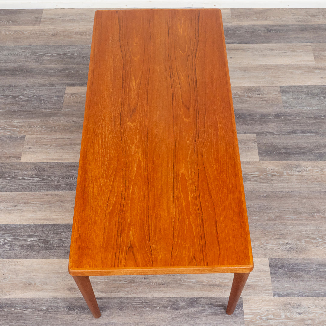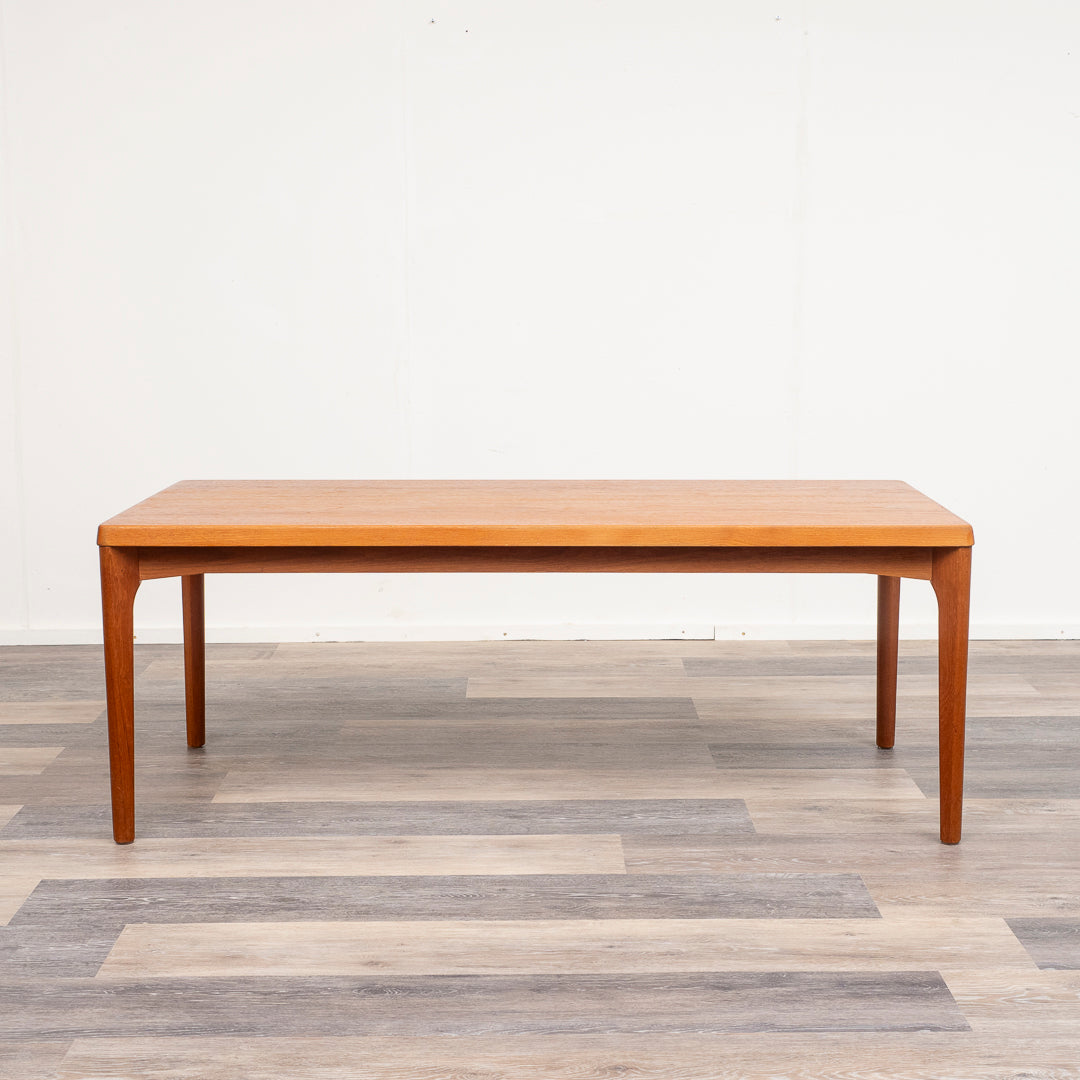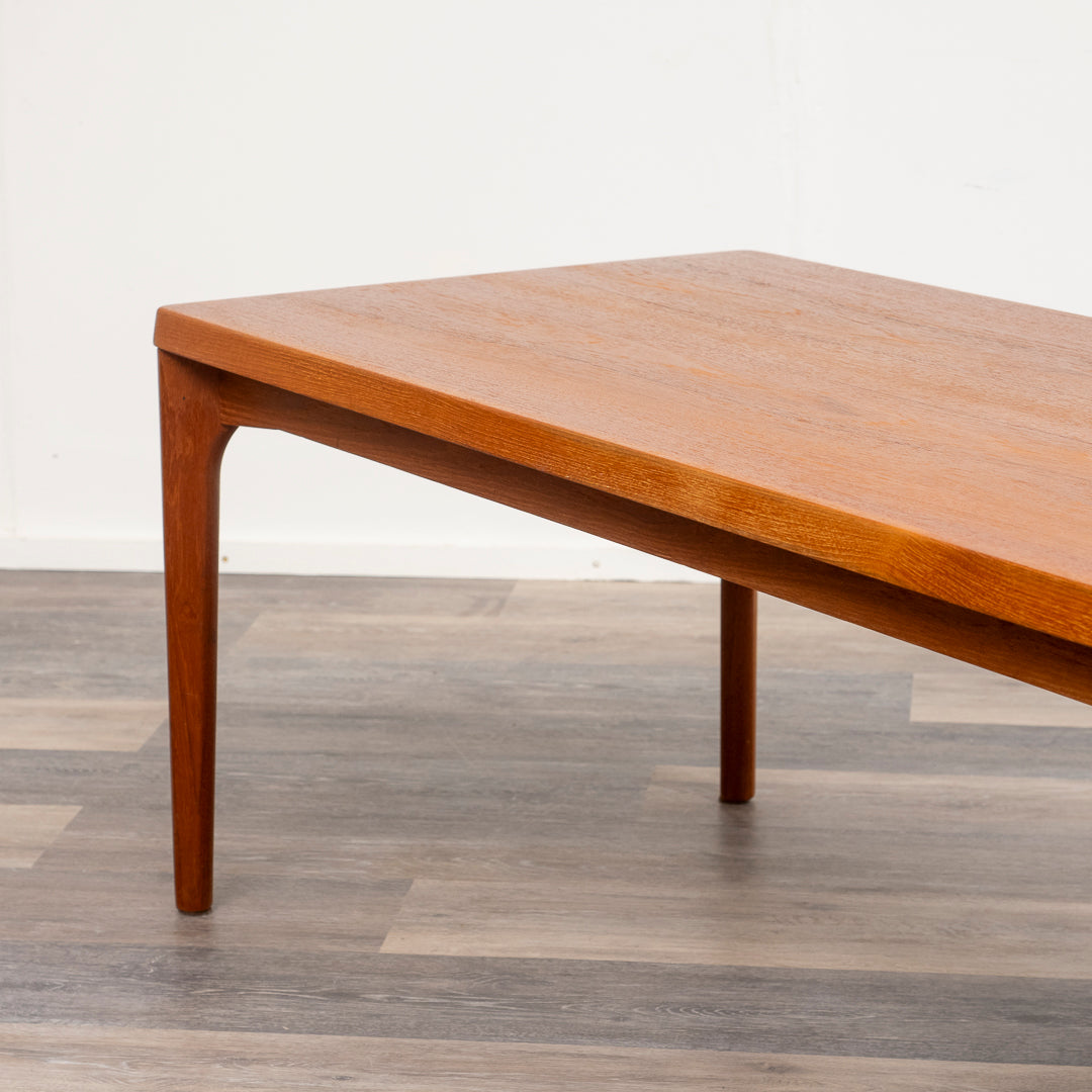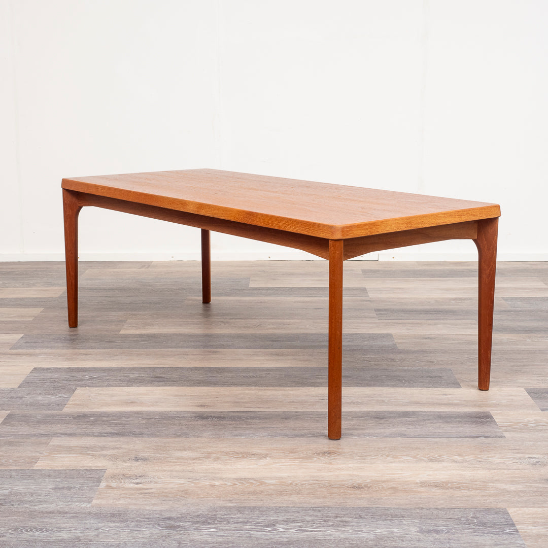 Teak coffee table manufactured by Vejle Stole Møbelfabrik in the 1960s in Denmark. The coffee table is a Danish design classic. Design Henning Kjærnulf . The coffee table has been restored and is in good condition. Dimensions: H: 44 cm L: 150 cm W: 47 cm.