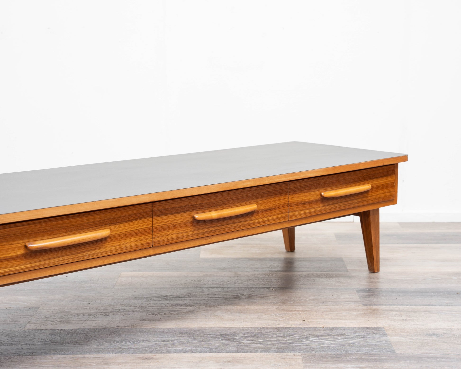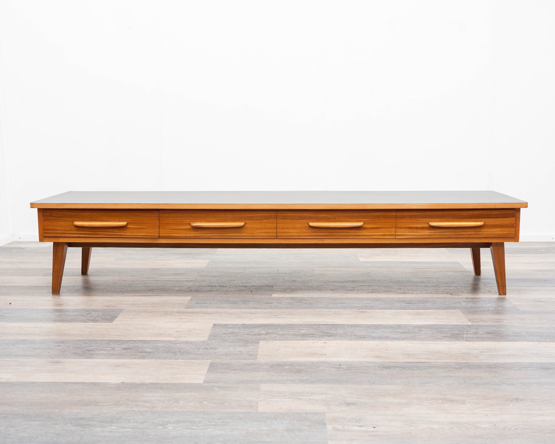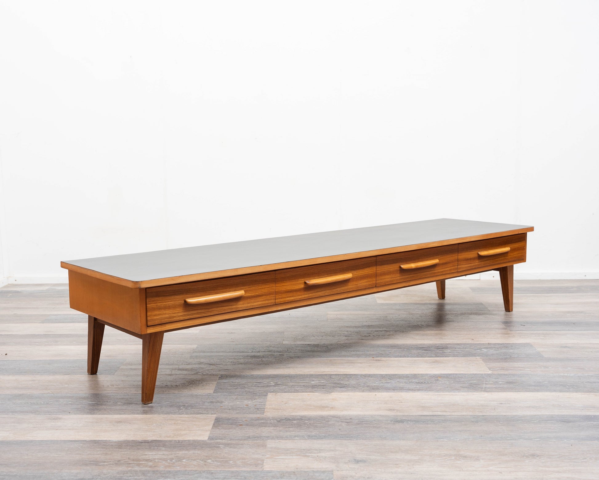 Un buffet/meuble bas simple des années 1950 au design intemporel. Son plateau a été restauré professionnellement et recouvert de Resopal noir, un revêtement facile à nettoyer et résistant. La structure en frêne repose sur quatre pieds inclinés, conférant au meuble une élégante légèreté. Quatre tiroirs spacieux, plaqués zebrano et dotés de poignées en bois massif, offrent un espace de rangement pratique. Ce meuble est en très bon état général et constitue un exemple exceptionnel de mobilier vintage, s'intégrant harmonieusement aux intérieurs modernes comme classiques. Idéal pour les amateurs de mobilier rétro.