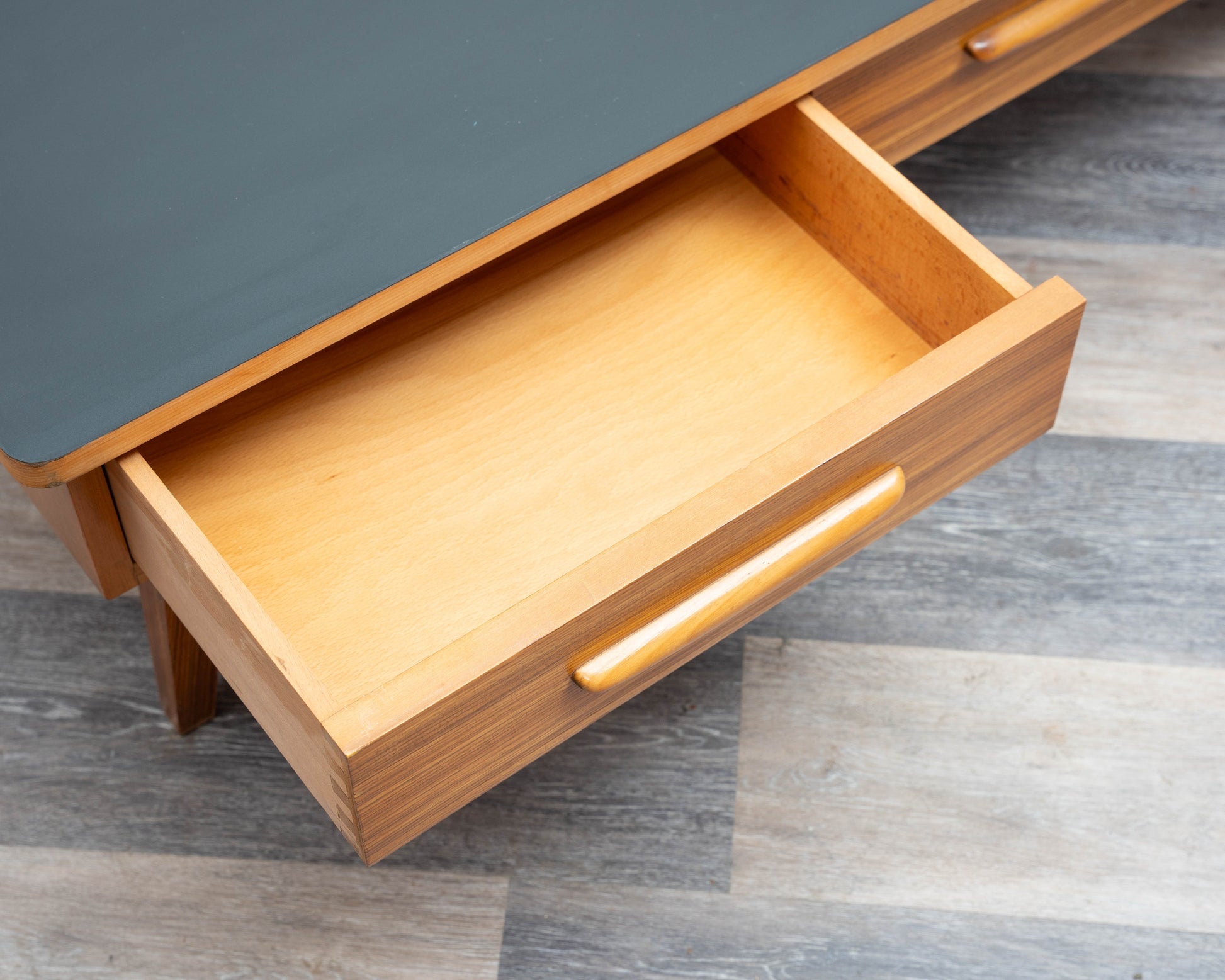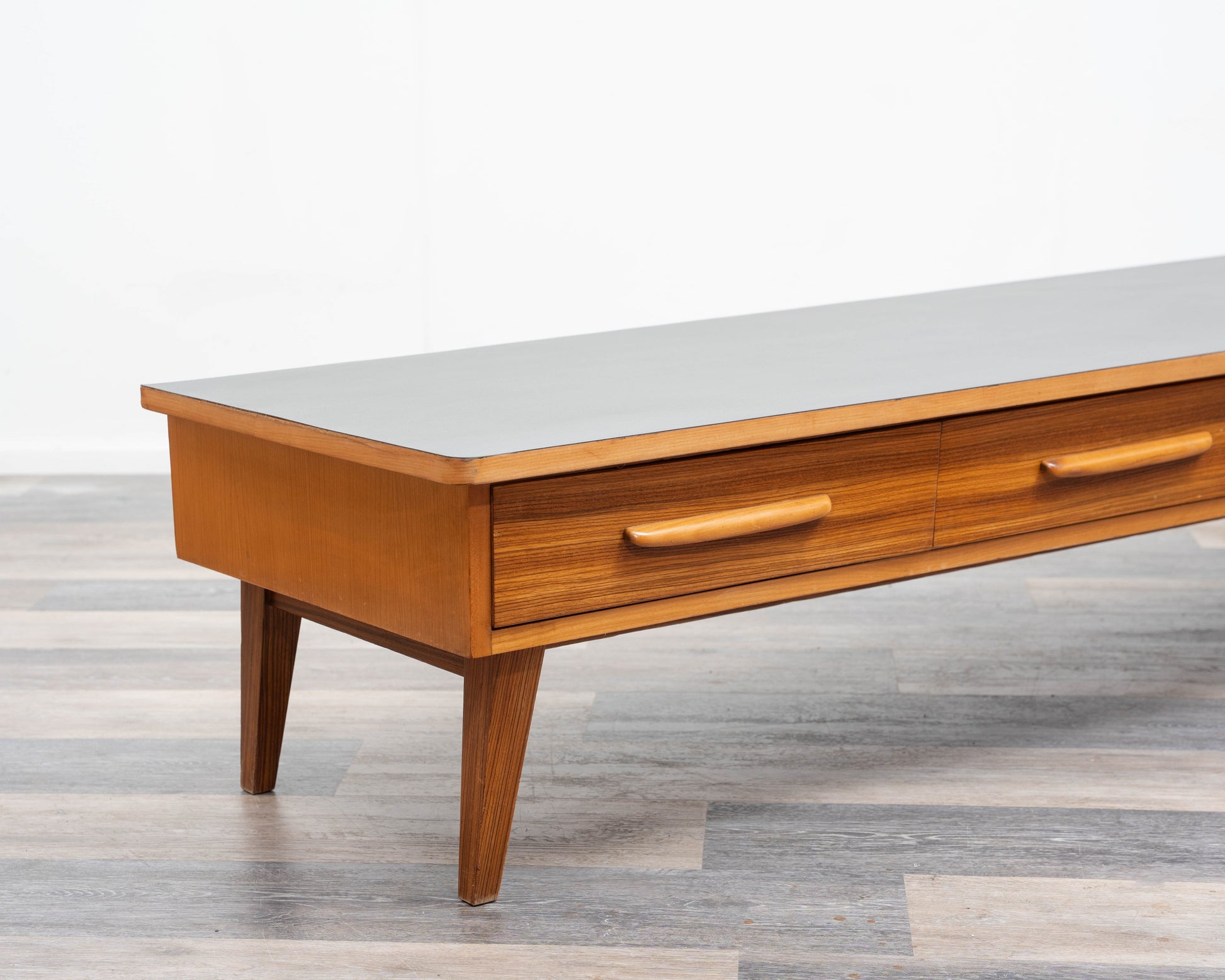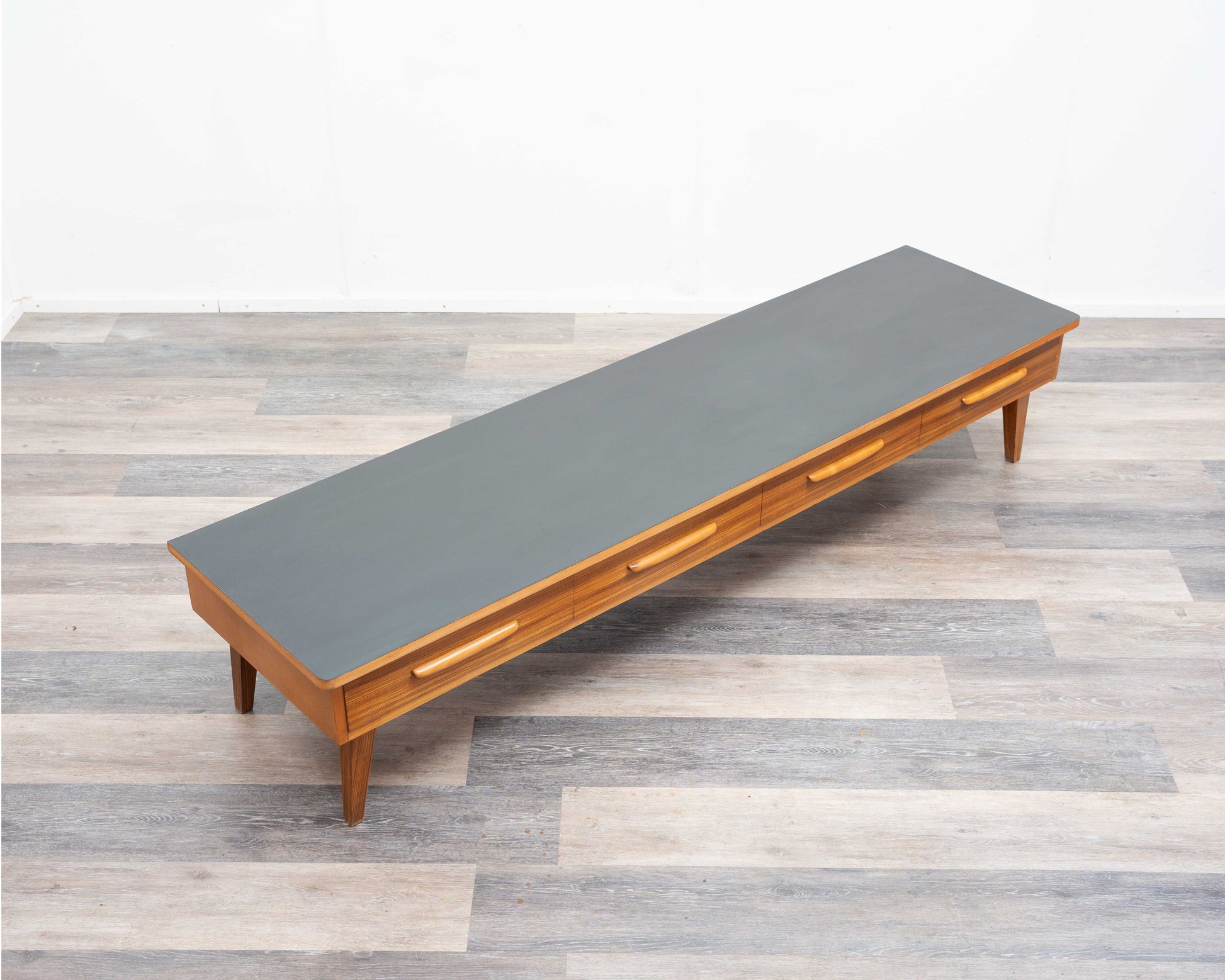 Un buffet/meuble bas simple des années 1950 au design intemporel. Son plateau a été restauré professionnellement et recouvert de Resopal noir, un revêtement facile à nettoyer et résistant. La structure en frêne repose sur quatre pieds inclinés, conférant au meuble une élégante légèreté. Quatre tiroirs spacieux, plaqués zebrano et dotés de poignées en bois massif, offrent un espace de rangement pratique. Ce meuble est en très bon état général et constitue un exemple exceptionnel de mobilier vintage, s'intégrant harmonieusement aux intérieurs modernes comme classiques. Idéal pour les amateurs de mobilier rétro.