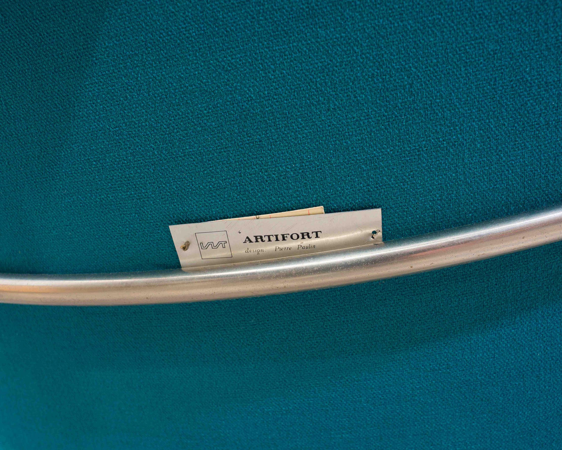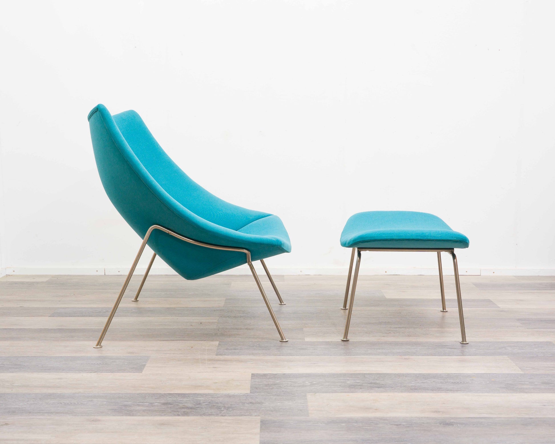 L'emblématique fauteuil Oyster de Pierre Paulin pour Artifort – un classique du design des années 1960. Son design organique en forme de coquillage séduit par son confort et son élégance intemporelle. Le précédent propriétaire l'a retapissé d'un tissu turquoise de haute qualité. Ses pieds en métal chromé lui confèrent une allure moderne et aérienne. Ce fauteuil est en excellent état, quasiment neuf. L'étiquette du fabricant est encore présente sous le fauteuil. Un repose-pieds assorti est inclus. Dimensions : 87 cm de large, 84 cm de haut, 75 cm de profondeur, hauteur d'assise : 35 cm. Une pièce de collection pour les amateurs de mobilier vintage authentique.