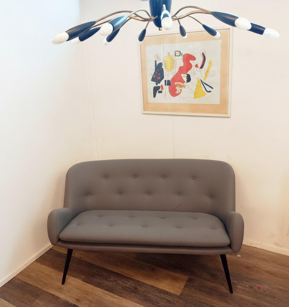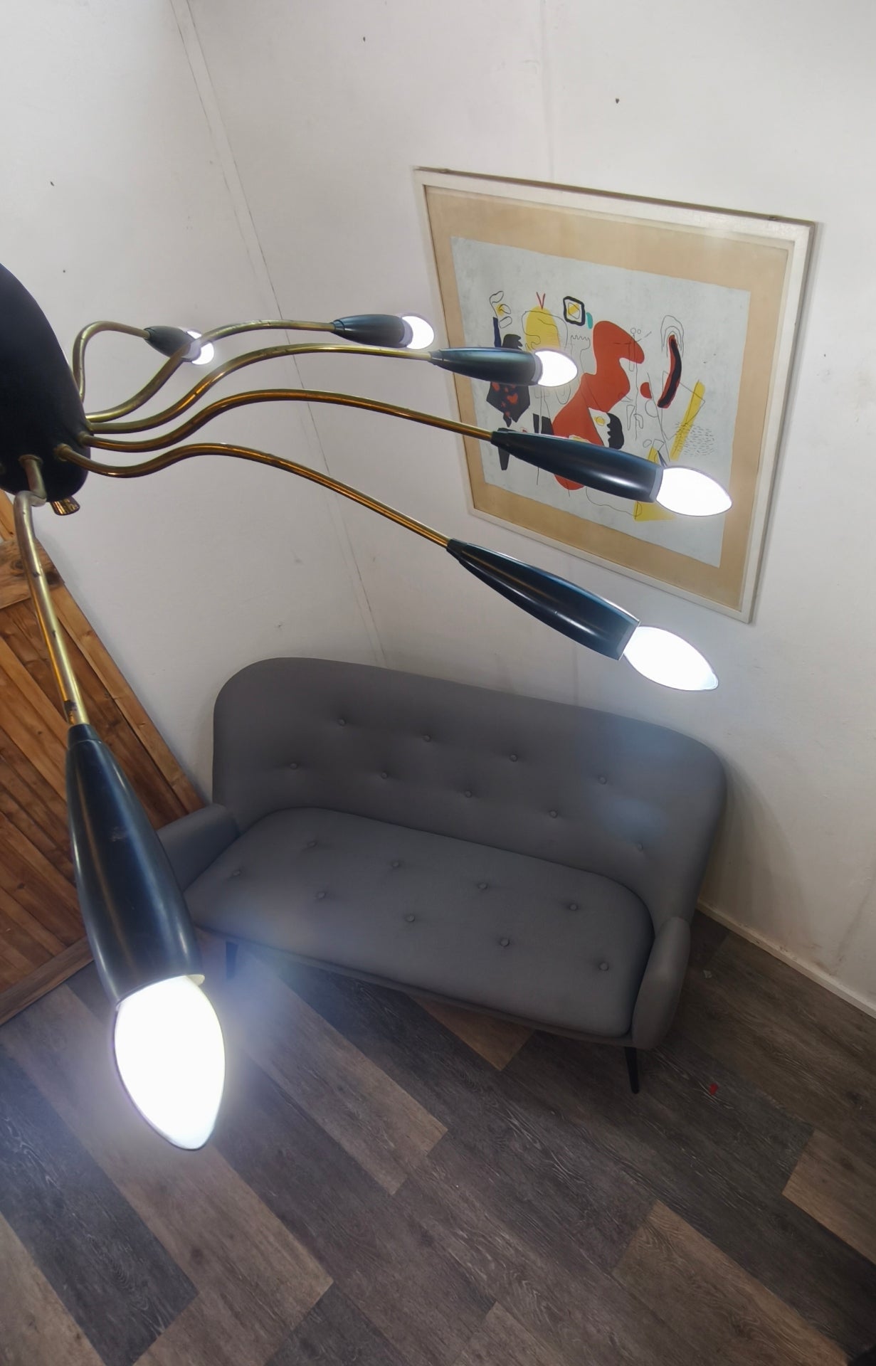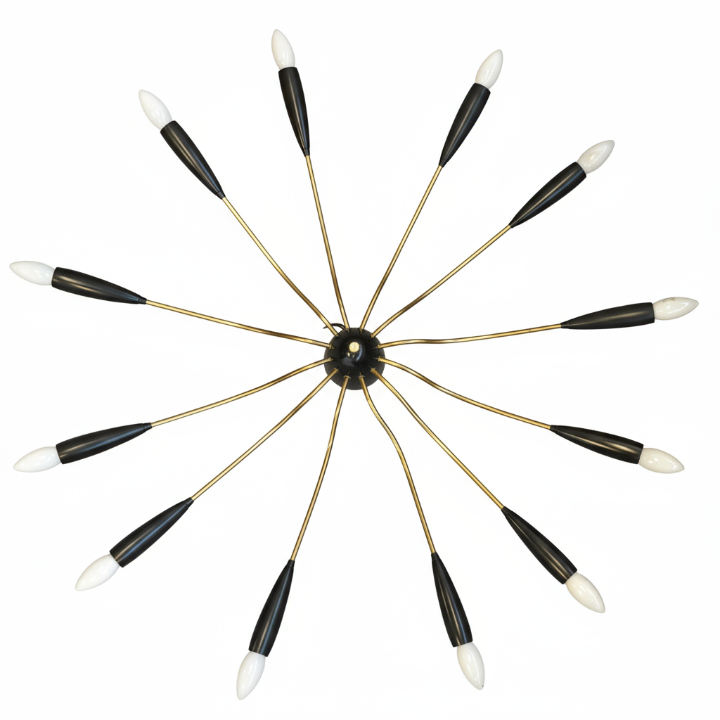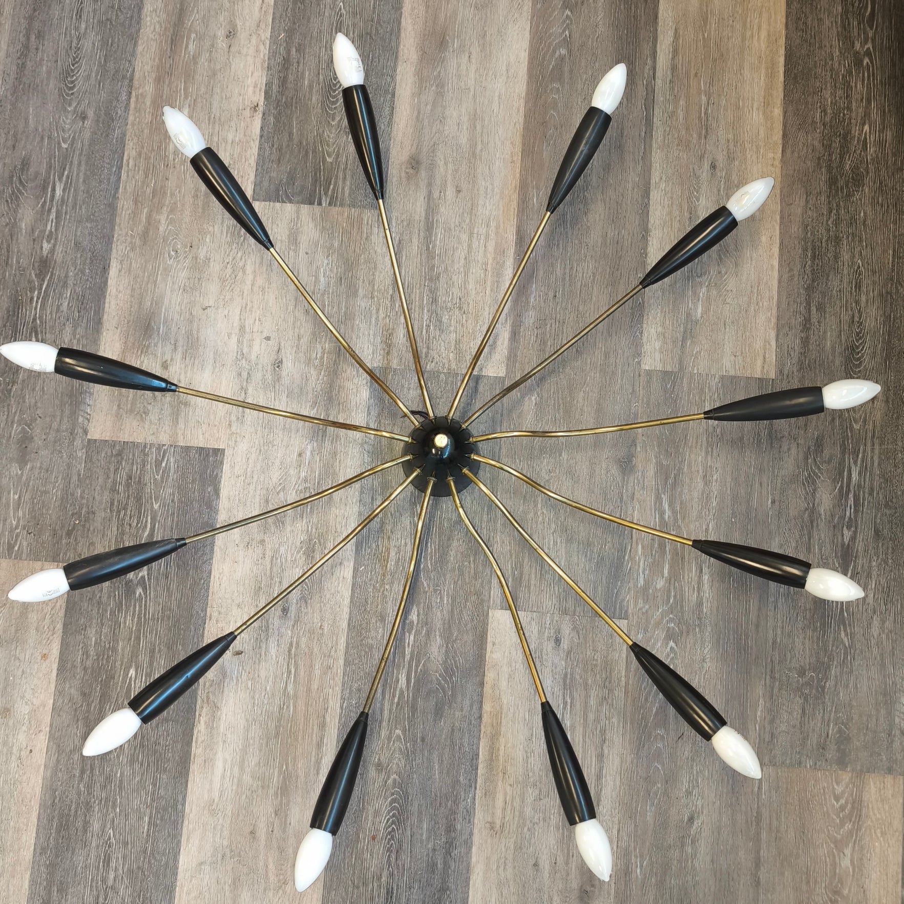Beeindruckende Sputnik-Deckenleuchte aus den 1950er Jahren mit zwölf eleganten Messingarmen und schwarzen Metallfassungen. Die elektrische Anlage wurde fachgerecht überprüft und ist vollständig funktionsfähig. Ein charaktervolles Stück für Sammler und Liebhaber authentischer Designklassiker aus dieser Epoche – ideal zur Aufwertung von Interieurs mit Vintage-Anspruch.