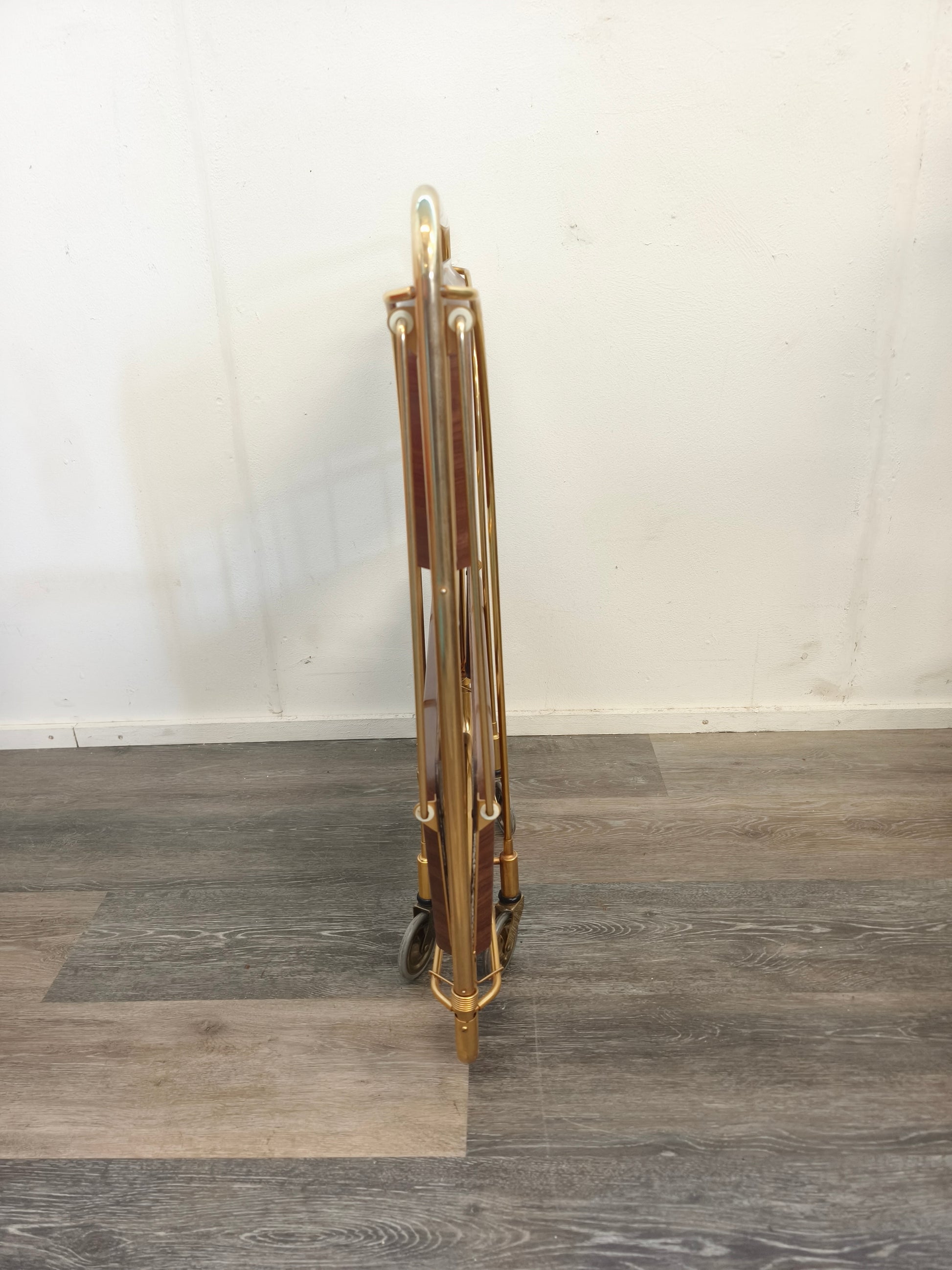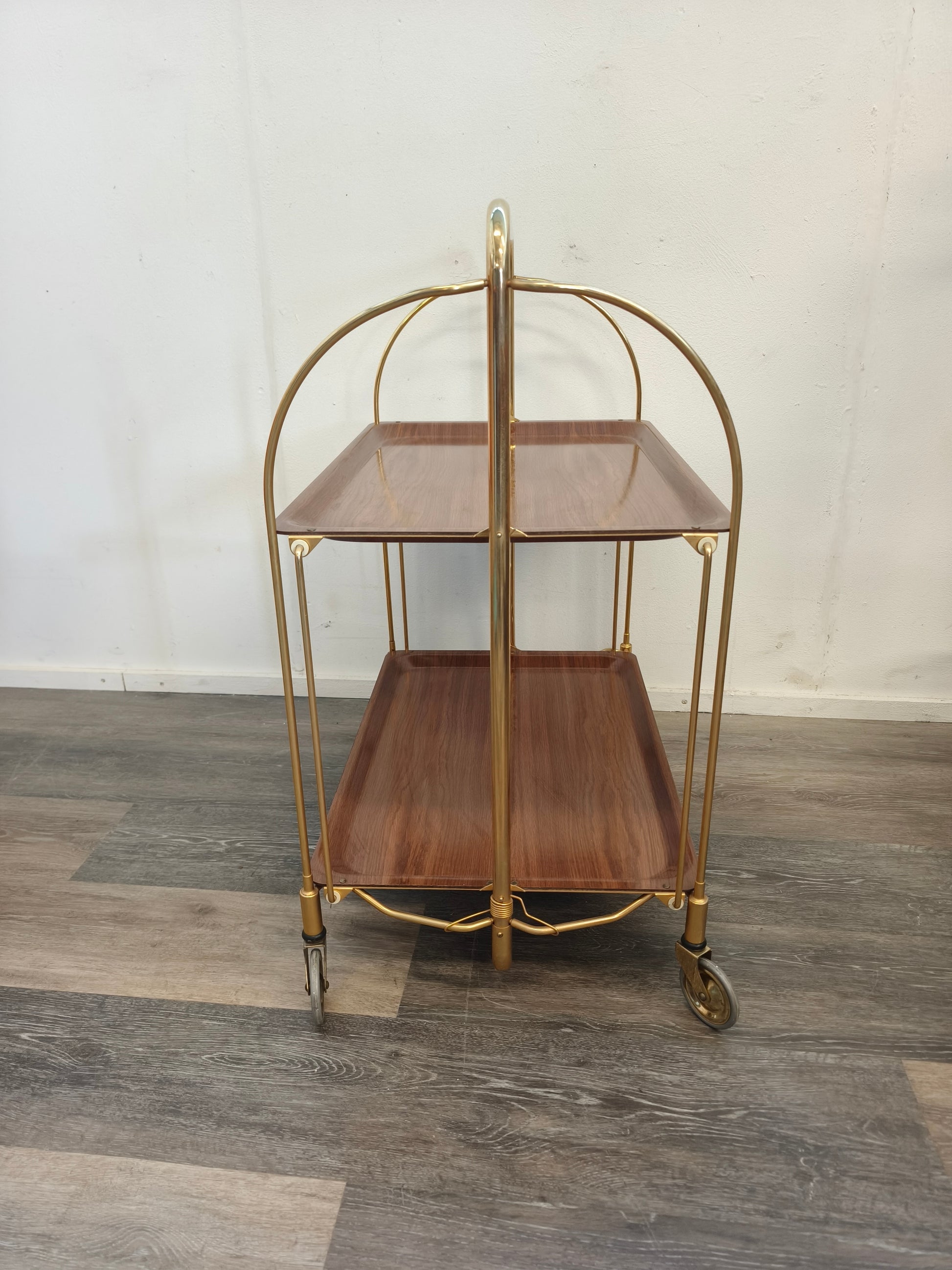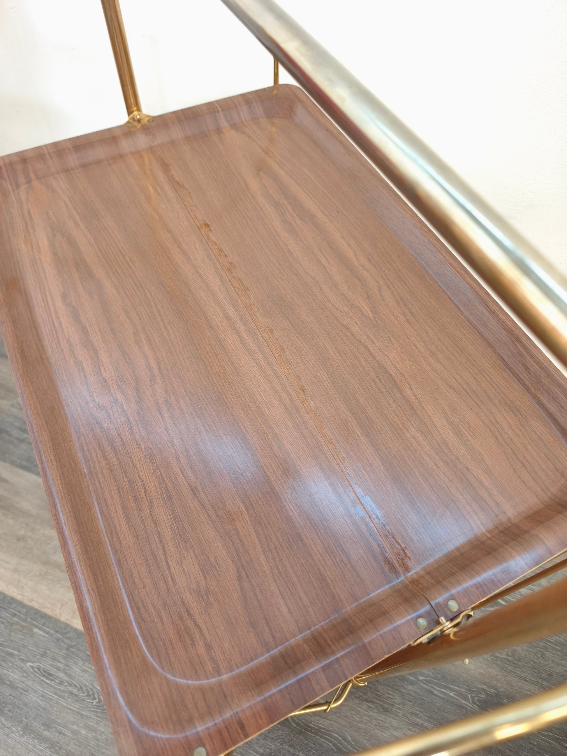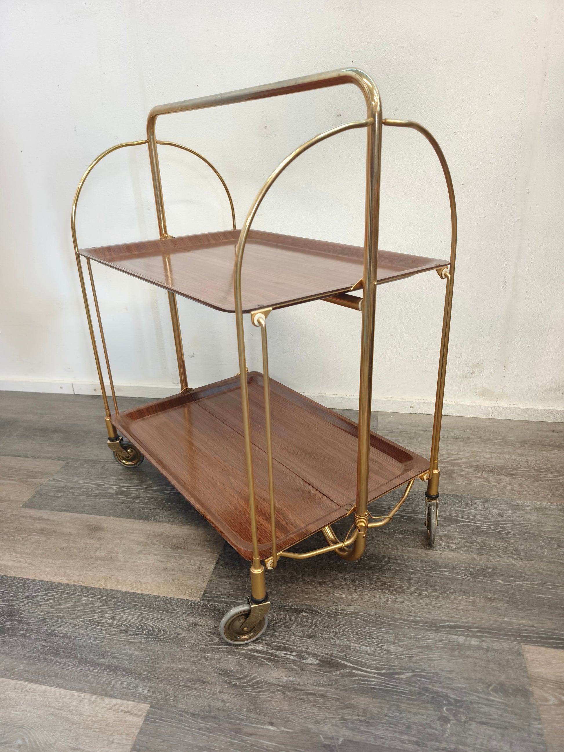Servierwagen/Dinett wagen aus den 60er Jahren mit einem Metallgestell in Messingfarbe, und Resopal-Tabletten in Holzoptik. Der Servierwagen steht auf vier Rollen mit schwarzen Gummirädern. Der Wagen ist zweiteilig zusammenfaltbar und befindet sich in einem sehr guten Originalzustand mit minimalen Gebrauchsspuren.