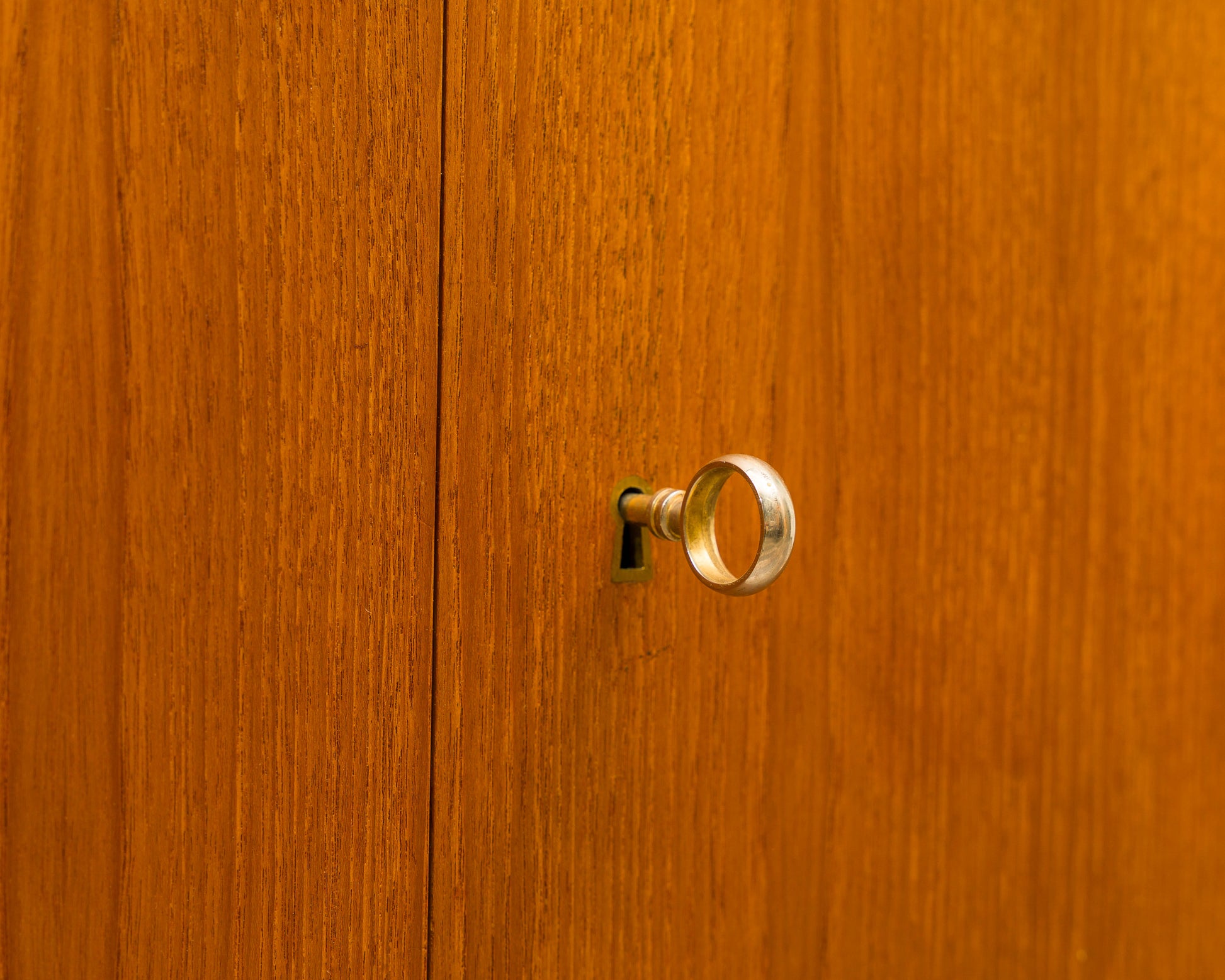 Regal aus Teakholz mit 2-türiger, abschließbarer Kommode/Sideboard im skandinavischen Design. Die Regale und die Kommode sind mit höhenverstellbaren Einlegeböden ausgestattet. die rückwand eines elements ist in anthrazitgrau gehalten. Die Kommode ist auf spitz zulaufenden Füßen aus massivem Buchenholz platziert.