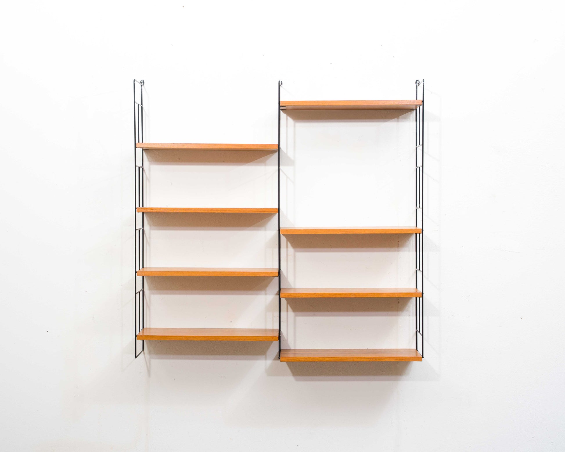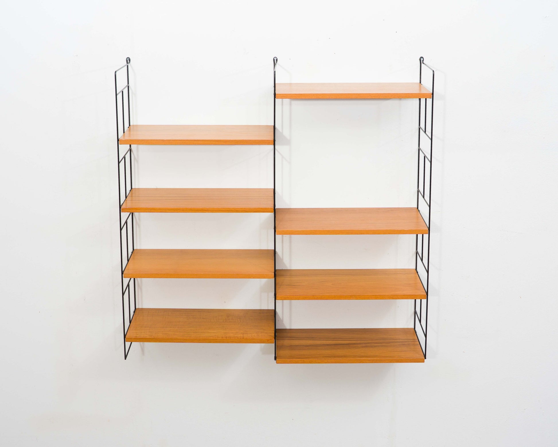 WHB, String Regal in Teakholz. Hier bieten wir ein Modell an in Teakfurnier mit acht Regalböden und drei langen, schwarzen Metallleitern. Sehr guter überarbeiteter Originalzustand mit kleineren Gebrauchsspuren.