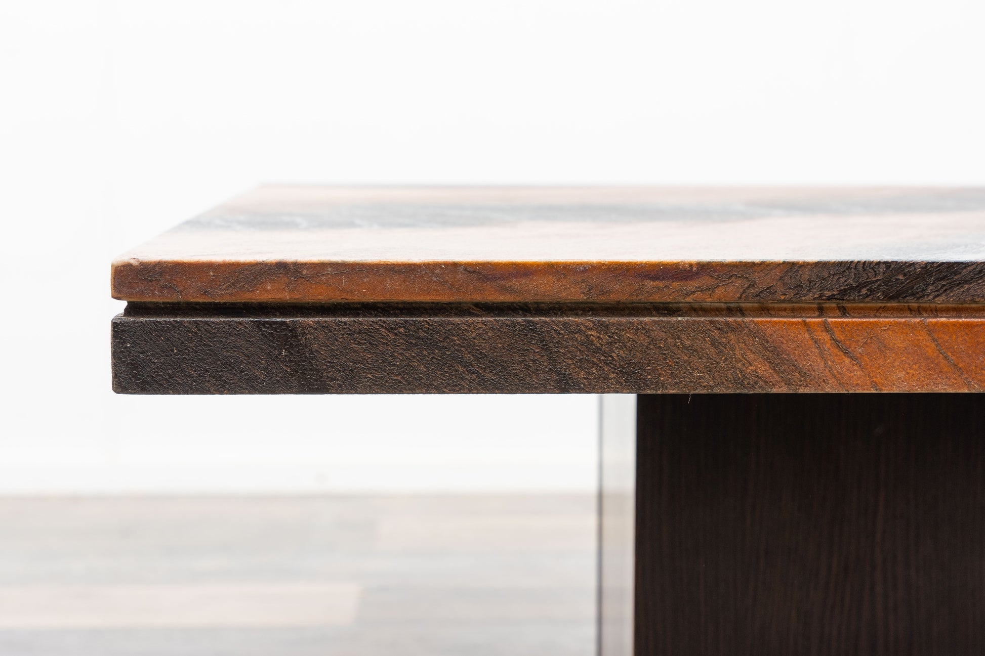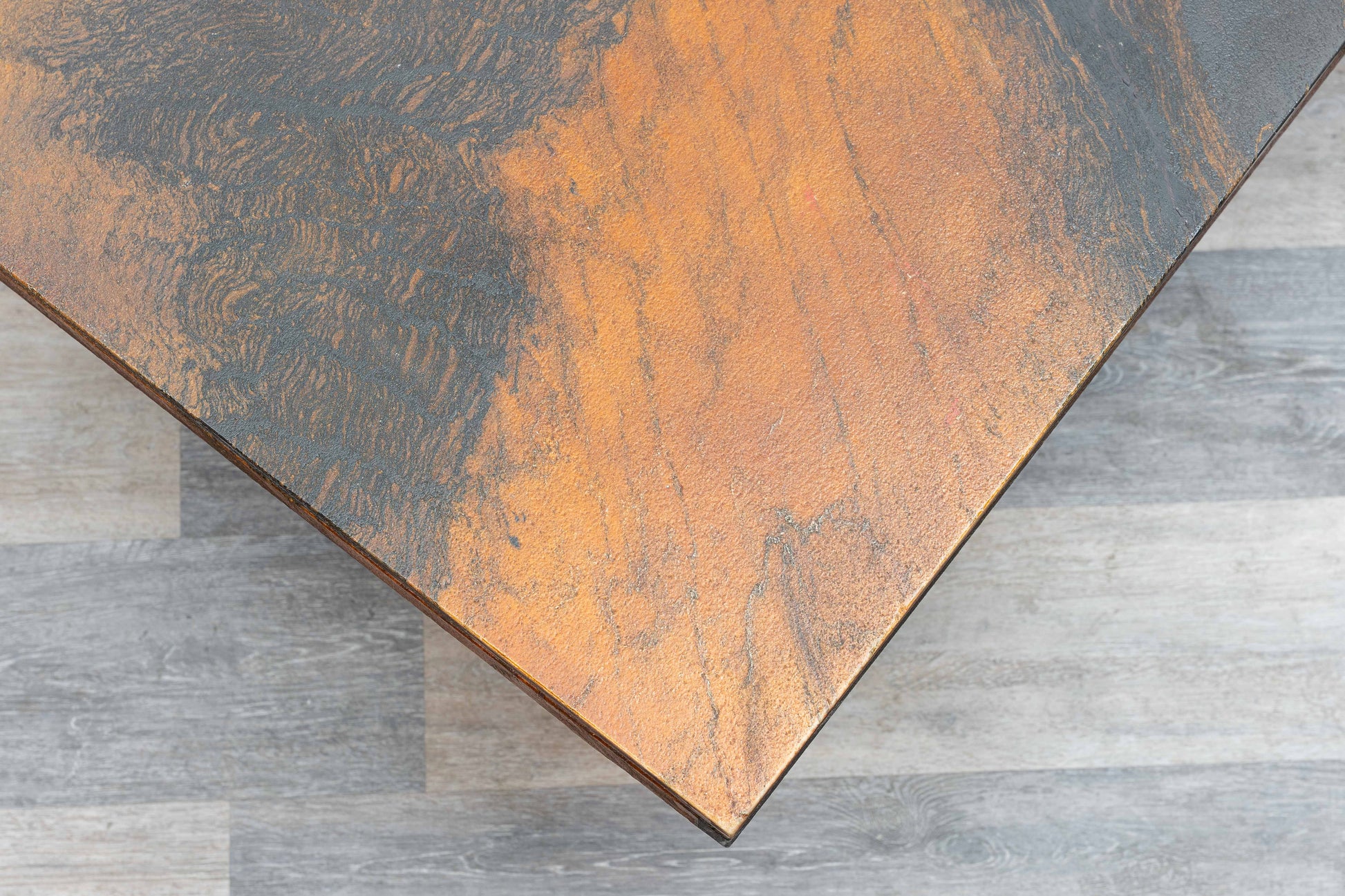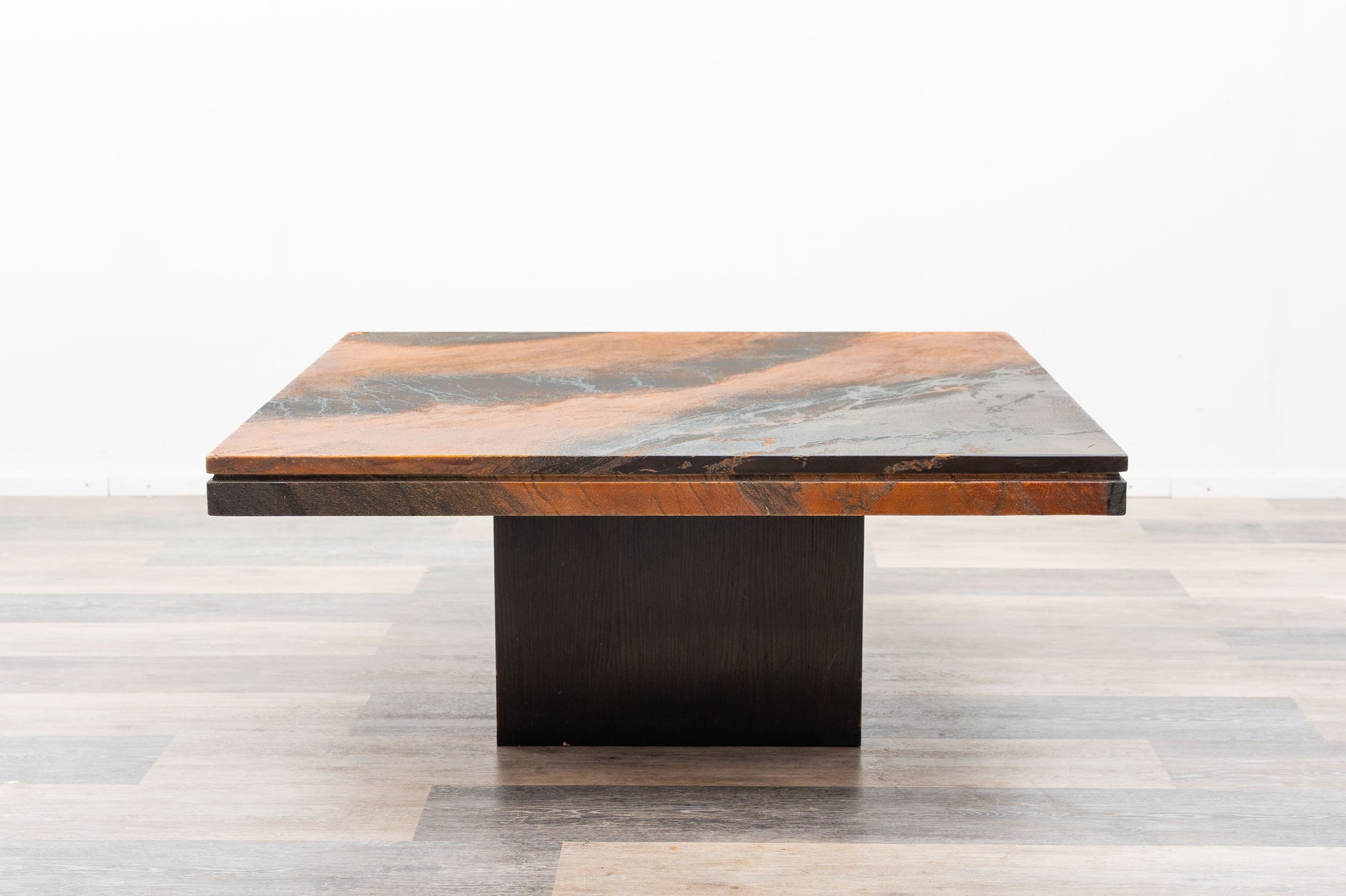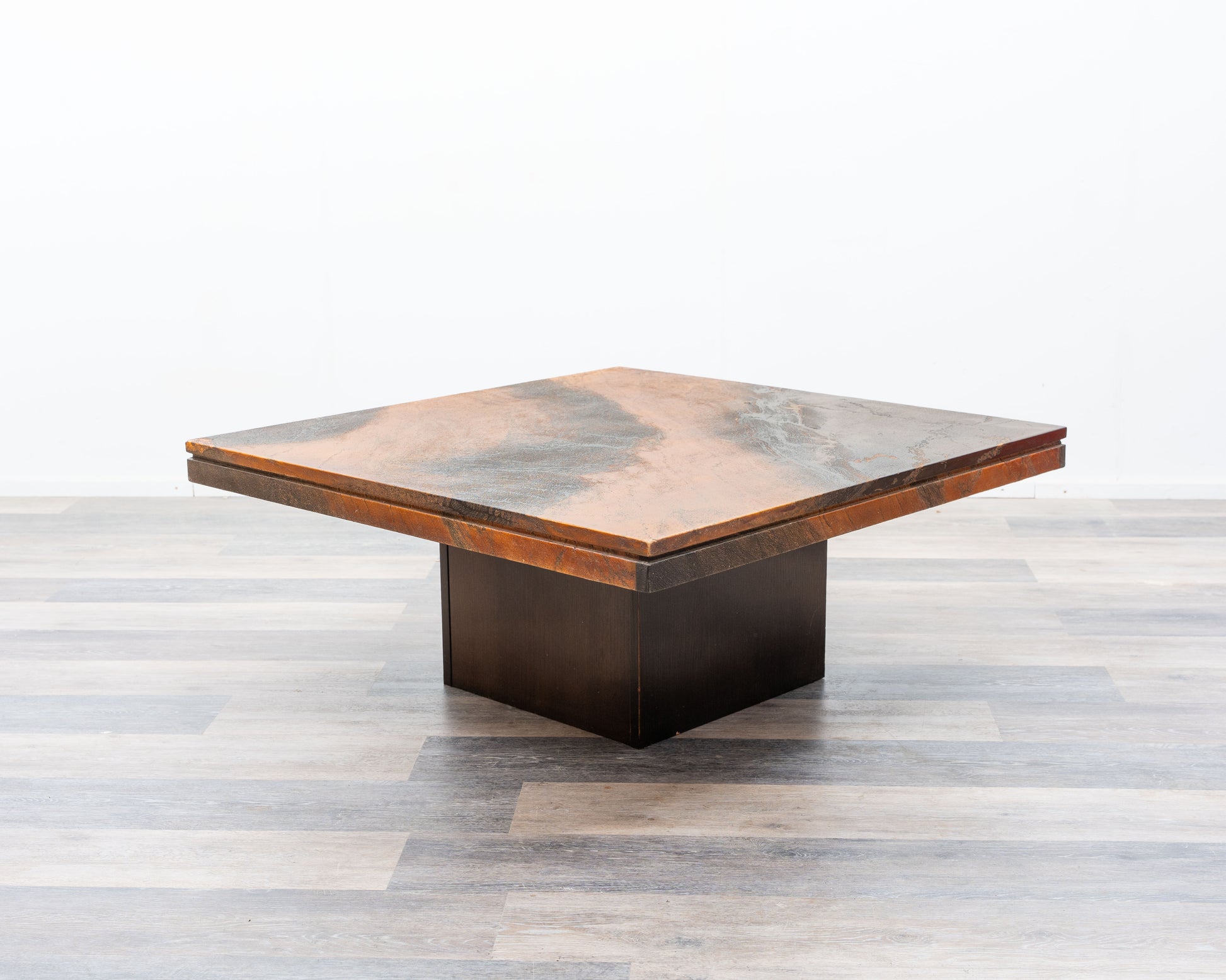 Massiver Couchtisch im kubistischen Brutalist-Design, quadratischer dunkler Holzfuß, auf dem eine schwere Marmorplatte liegt, die mit einem leicht strukturierten orange/ schwarz meliertem Kunstharz überzogen ist.