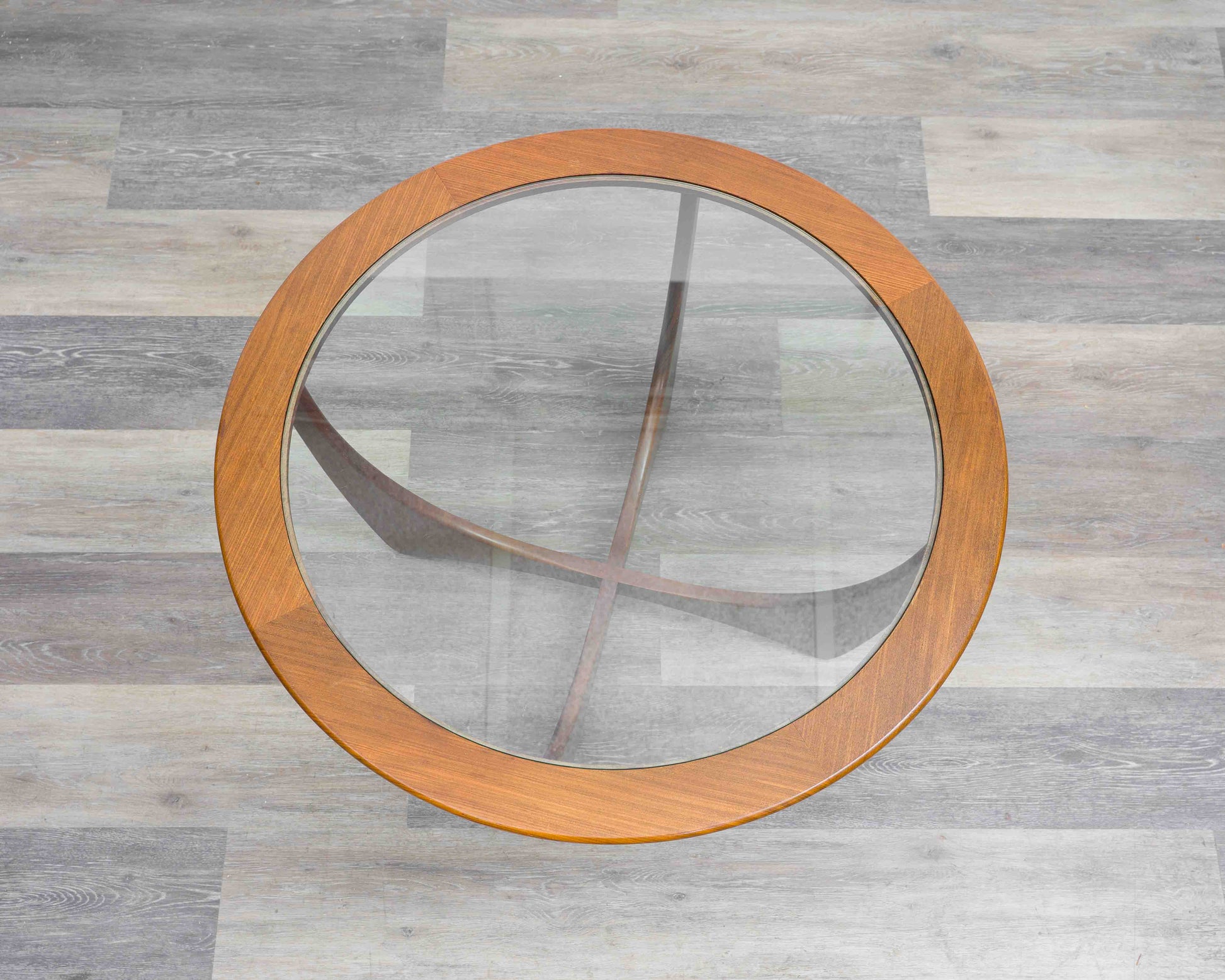 Schöner Couchtisch aus Teakholz mit einer eingelassene Glasplatte. Design von Victor Wilkins, für G-Plan, Großbritannien, Modell Astro. .Teak-Massivholz Einen Couchtisch in hochwertiger Verarbeitung und mit einem organischen Design. Sehr guter Originalzustand, überarbeitet. Minimale Gebrauchsspuren in Form von ganz leichten Kratzern auf der Glasoberfläche. Maße: Durchmesser 84 cm. Höhe 45 cm.