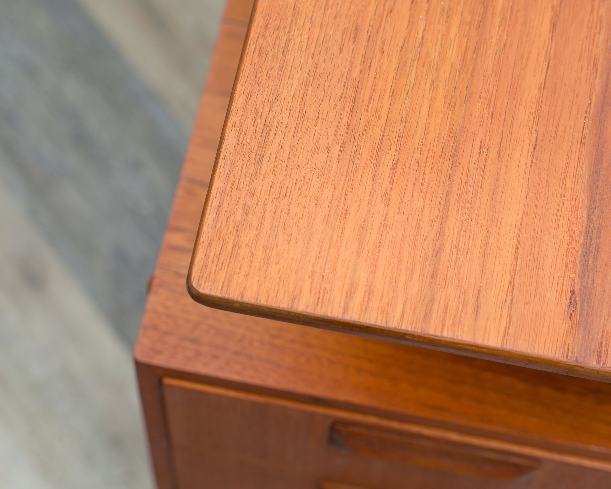 Links ein Container mit zwei Schubladen und Massivholzgriffen. Der Container kann auf Wunsch auch rechts montiert werden. Sehr schöner allgemeiner Zustand, mit leichten Gebrauchsspuren, professionell überarbeitet.