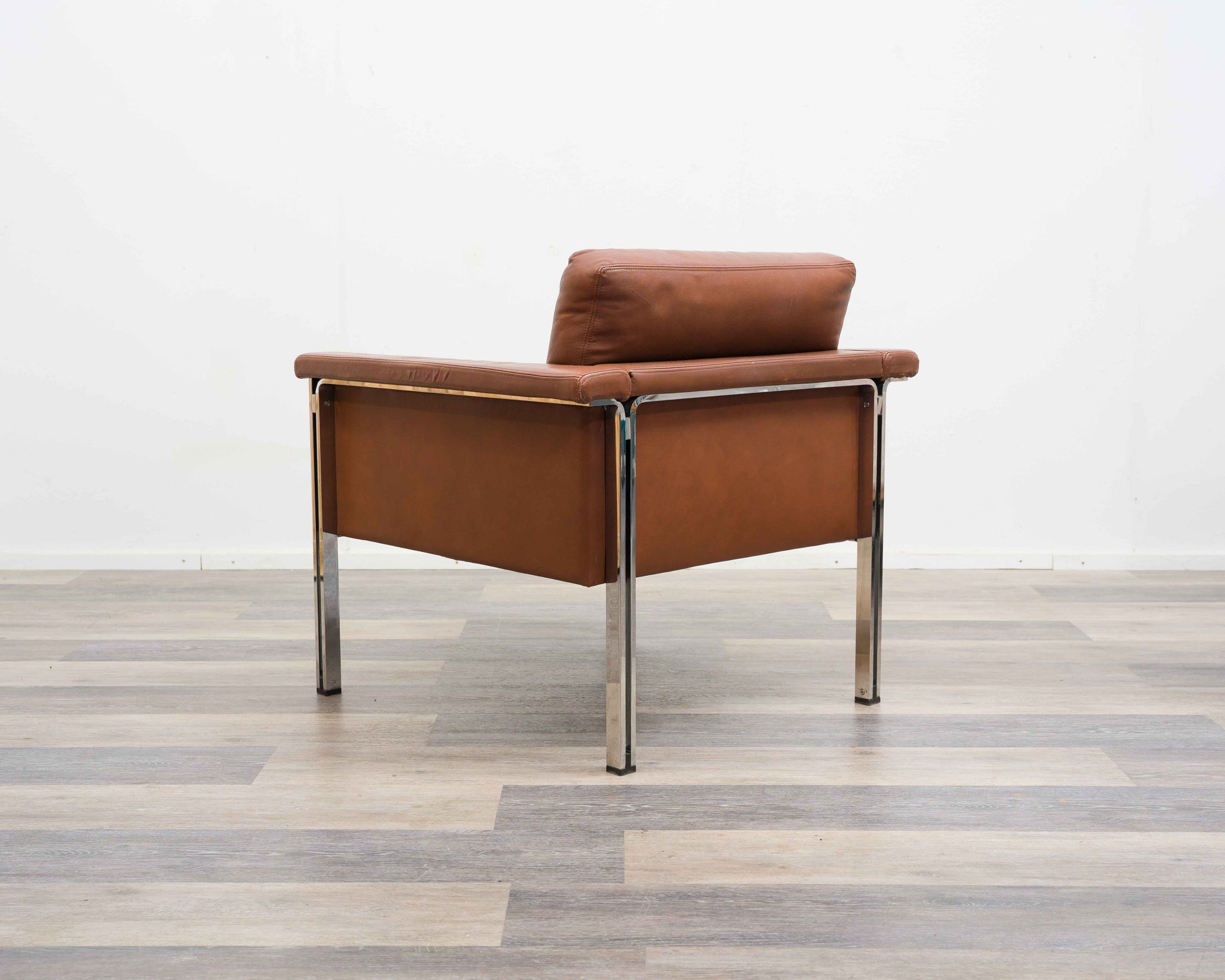 Gemütlicher Ledersessel aus den 70er Jahren von dem Hersteller Sitag. Das cognacbraune Leder mit leichter Patina verleiht dem Sessel nostalgischen Charme. Die losen Kissen mit Daunenfüllung bieten höchsten Sitzkomfort. Das Leder hat kleinere Gebrauchsspuren, aber keine Risse oder Löcher. Das verchromte Metallgestell ist in einem sehr guten Zustand.