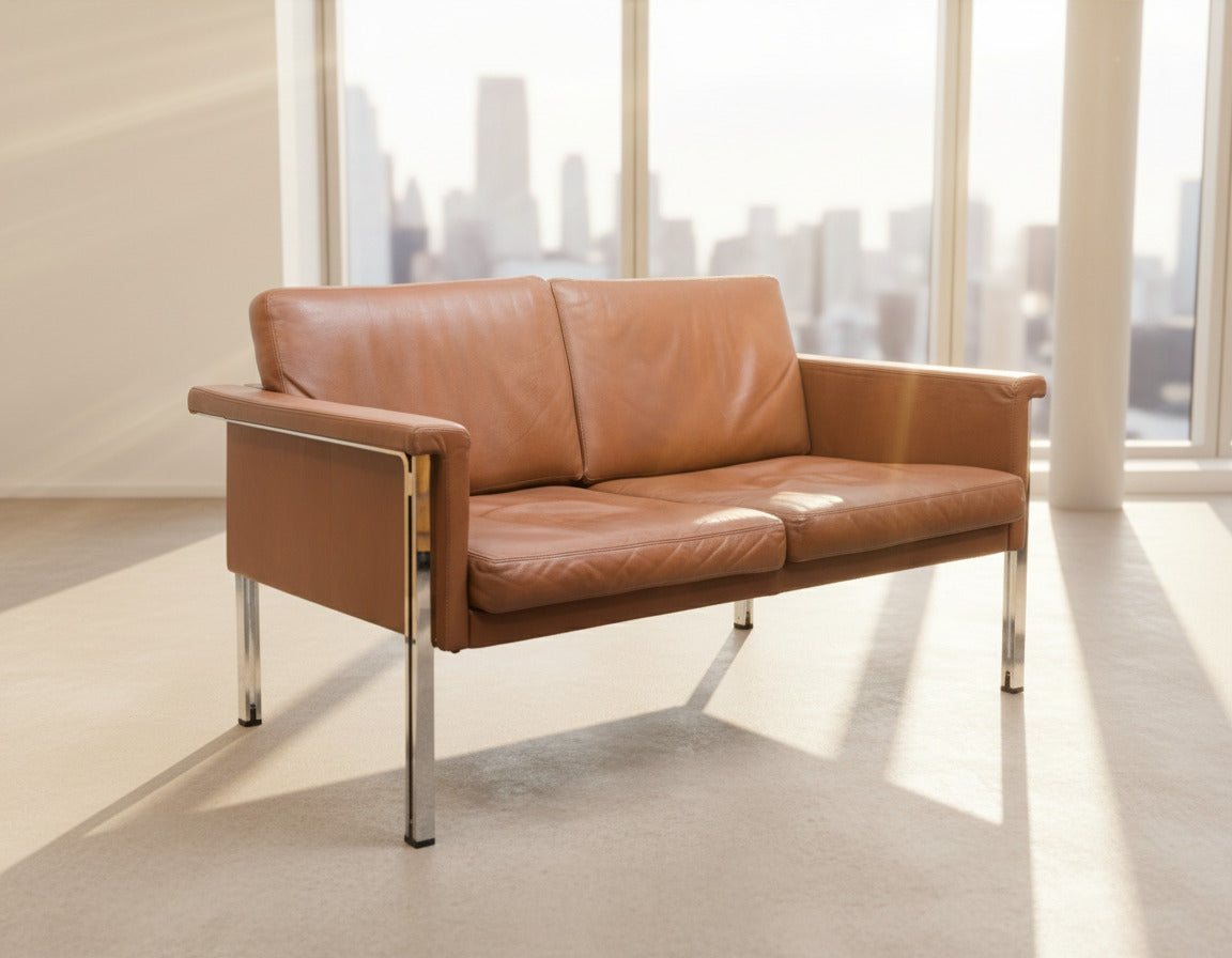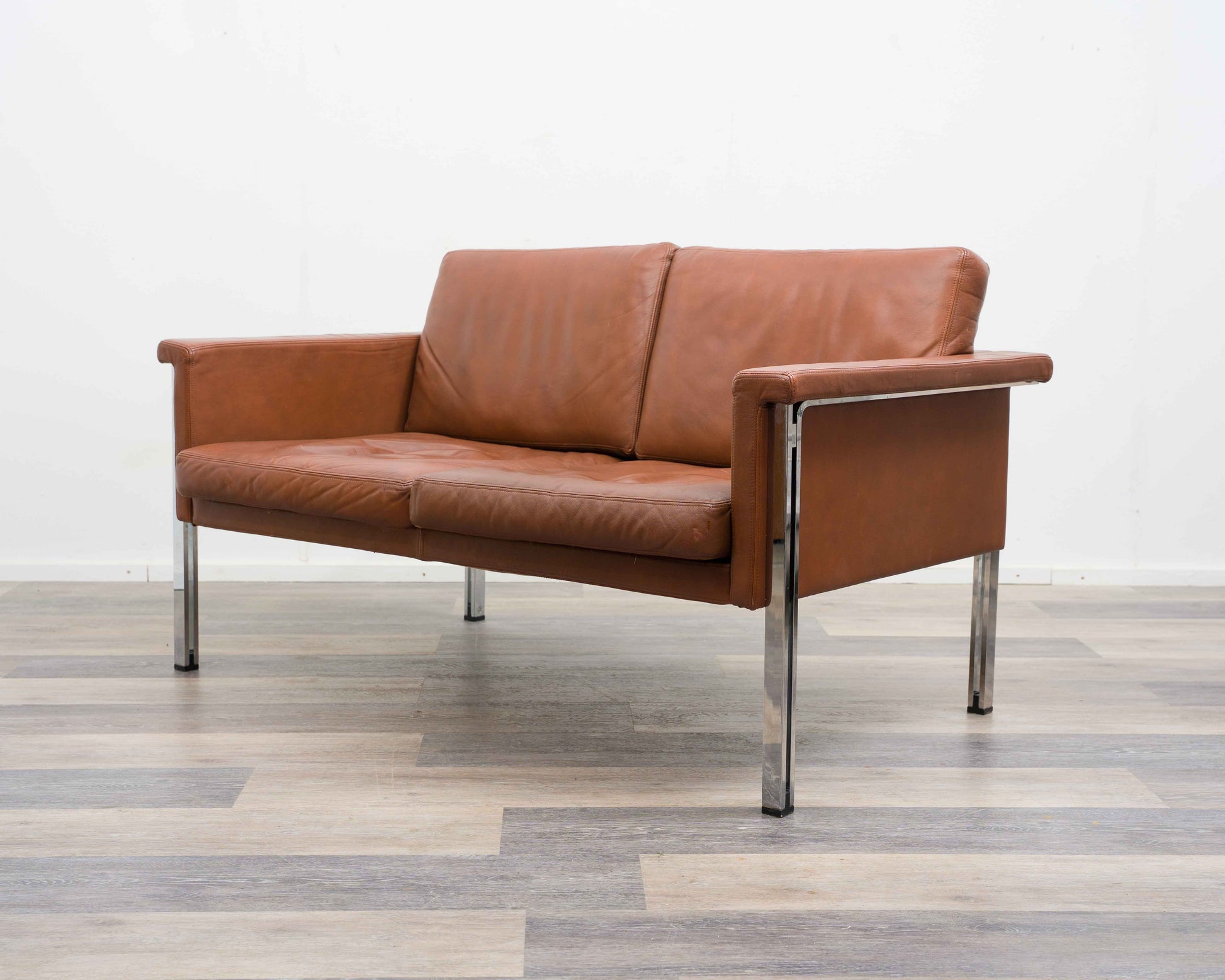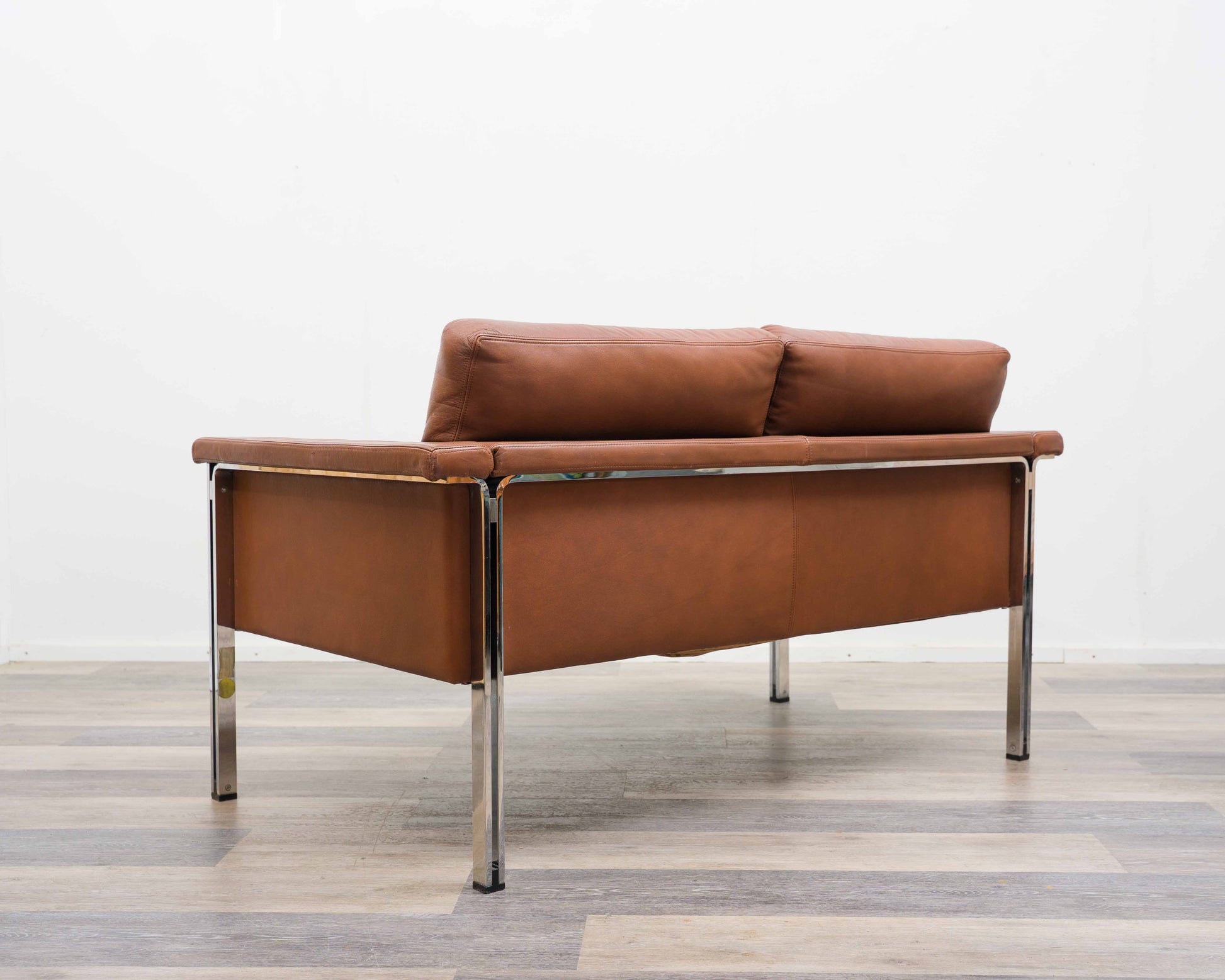 Gemütliches zweisitzer Sofa aus den 70er Jahren von dem Schweizer Hersteller Sitag. Das cognacbraune Leder mit leichter Patina verleiht dem Sessel nostalgischen Charme. Die losen Kissen mit Daunenfüllung bieten höchsten Sitzkomfort. Das Leder hat kleinere Gebrauchsspuren, aber keine Risse oder Löcher. Das verchromte Metallgestell ist in einem sehr guten Zustand.