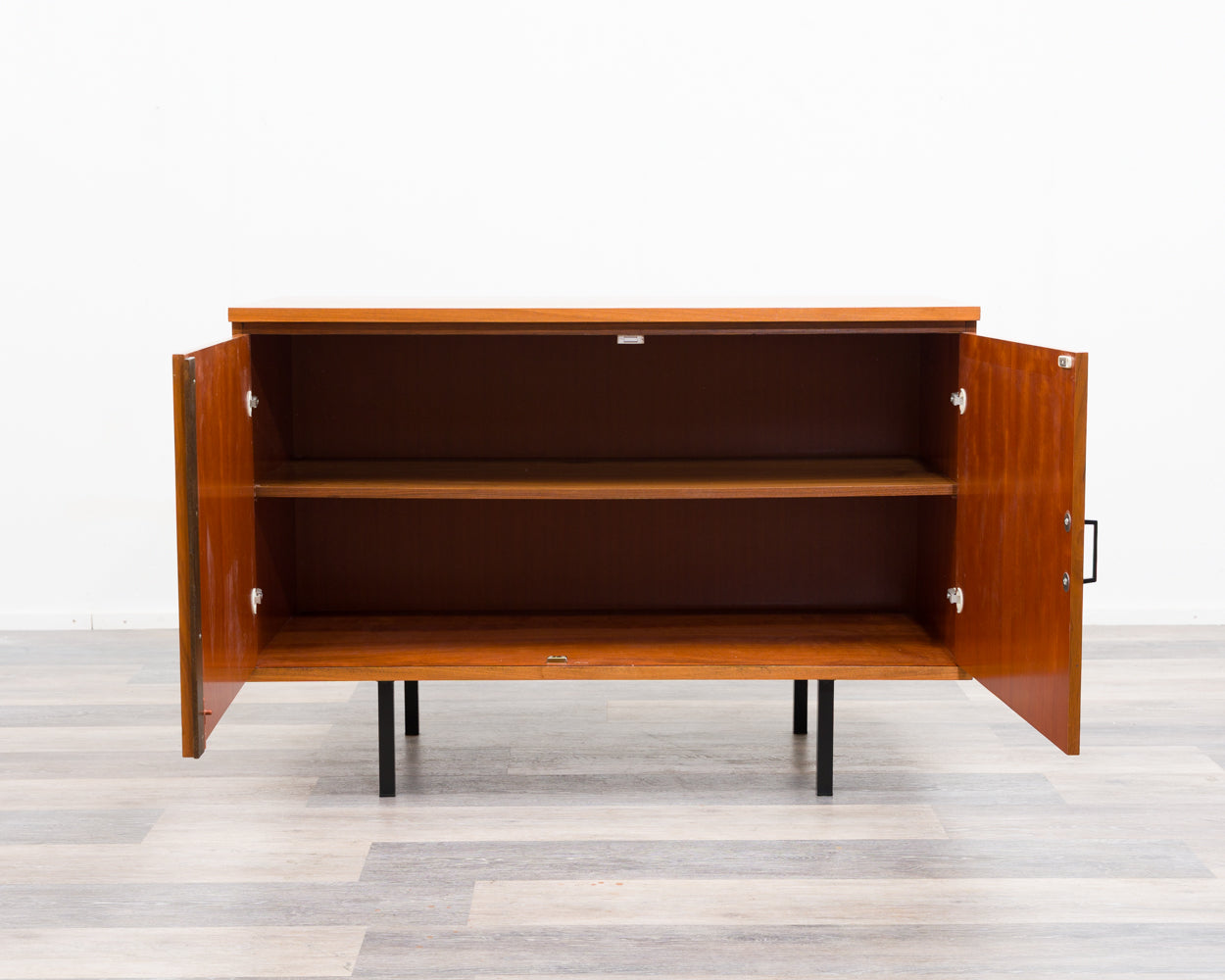 Hochwertige zweitürige Kommode in Nussbaum aus den 60er Jahren mit schönem Furnierbild. Im zeitlose kubische Design mit charakteristischen schwarzen Vierkant-Metallfüßen. Der Originalzustand ist hervorragend erhalten und gepflegt. Praktisch: abschließbare Türen für sichere Aufbewahrung und ein flexibel einsetzbarer Boden. Maße (B 117 cm, H 80 cm, T 50 cm). Das Sideboard wurde komplett überarbeitet und gereinigt.